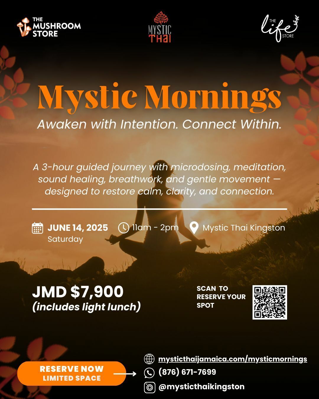 Step into a space of serenity, presence, and transformation. Mystic Mornings is a 3-hour guided wellness journey combining the power of microdosing, meditation, sound healing, breathwork, and gentle movement—curated to bring you back to yourself and align mind, body, and spirit.